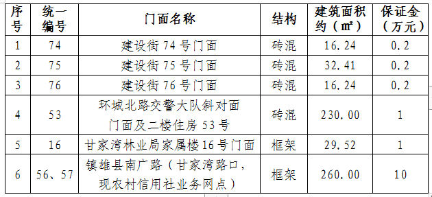 1、拍租6個(gè)門(mén)面3年期使用權(quán),詳見(jiàn)下表: