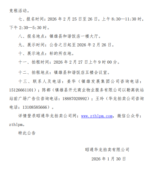鎮(zhèn)雄縣國有資產使用權拍租公告