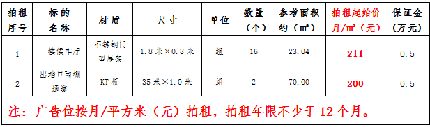 (四)拍租鎮(zhèn)雄縣開元商業(yè)物業(yè)服務有限公司以勒高鐵站站前廣場各類廣告位使用權,詳見下表: